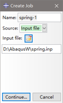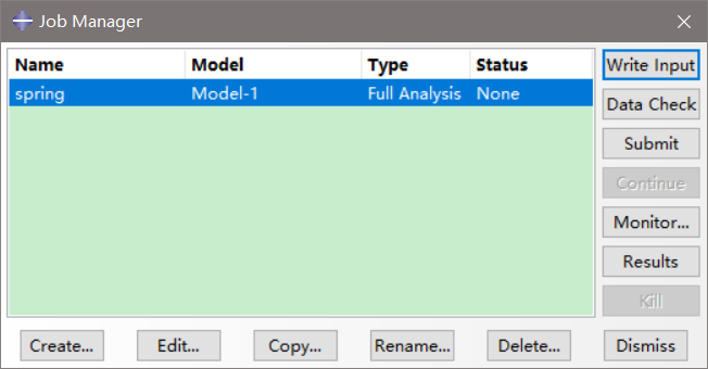 在模型中建立好线性弹簧后,进入Job模块,进入Job Manager对话框,创建一个Job之后,按下Write Input键,就创建好inp文件了。