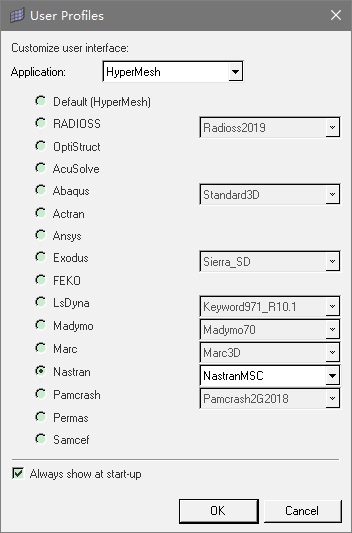 1、首先启动HyperMesh软件,在弹出的软件模板选项中,按照有限元模型实际求解器类型,为其选择Nastran求解器模板,点击OK按钮即可。