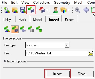 2、依次点击菜单栏的“Import Solver Deck”按钮,然后在File输入框中选择Nastran待转换的bdf文件,点击Import按钮开始导入模型文件。